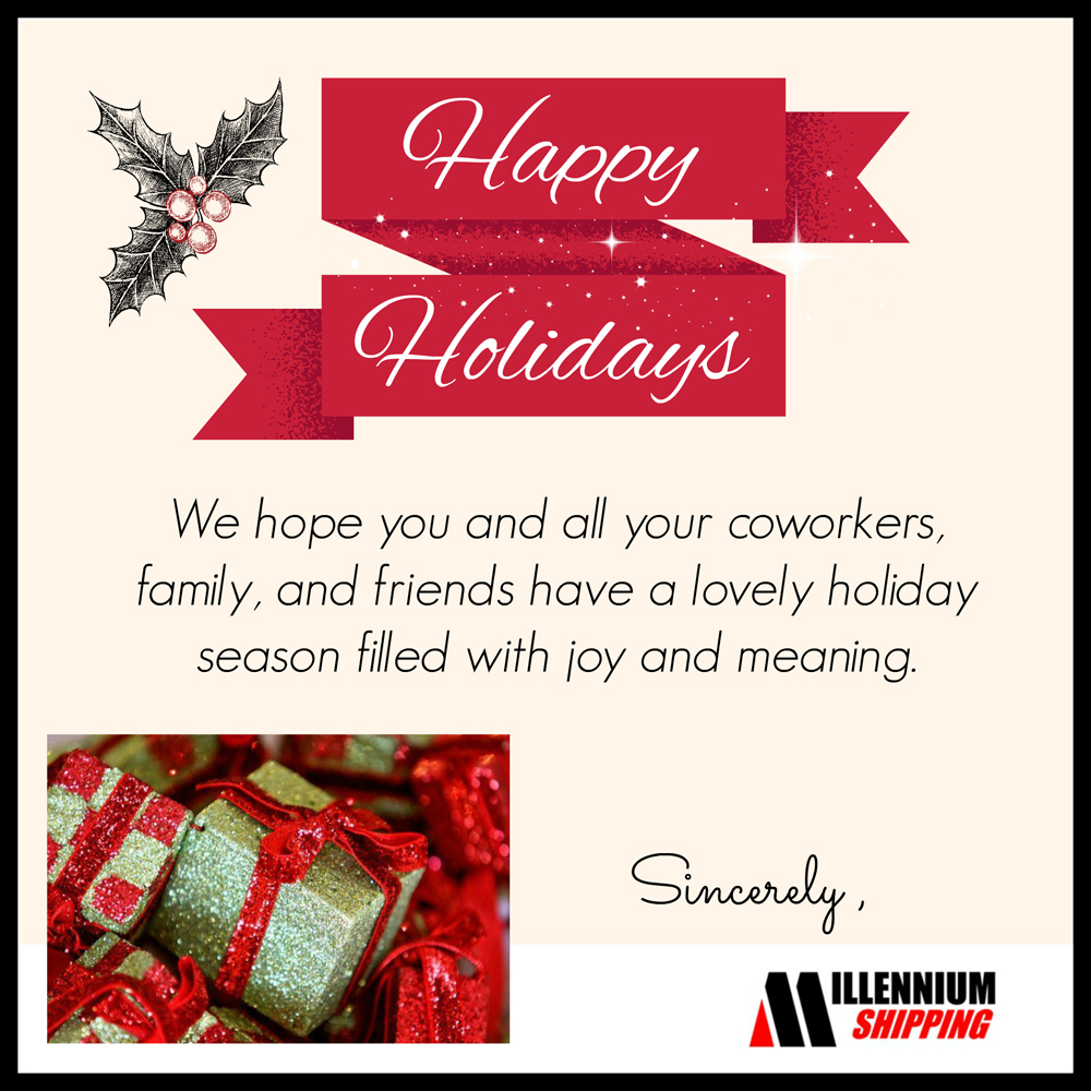 Millennium Shipping will be closed on 12/31 and 1/1.  Please let us know if you a have a time-sensitive shipment as the holidays can drastically affect transit time.